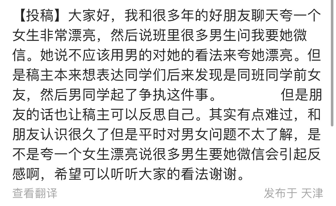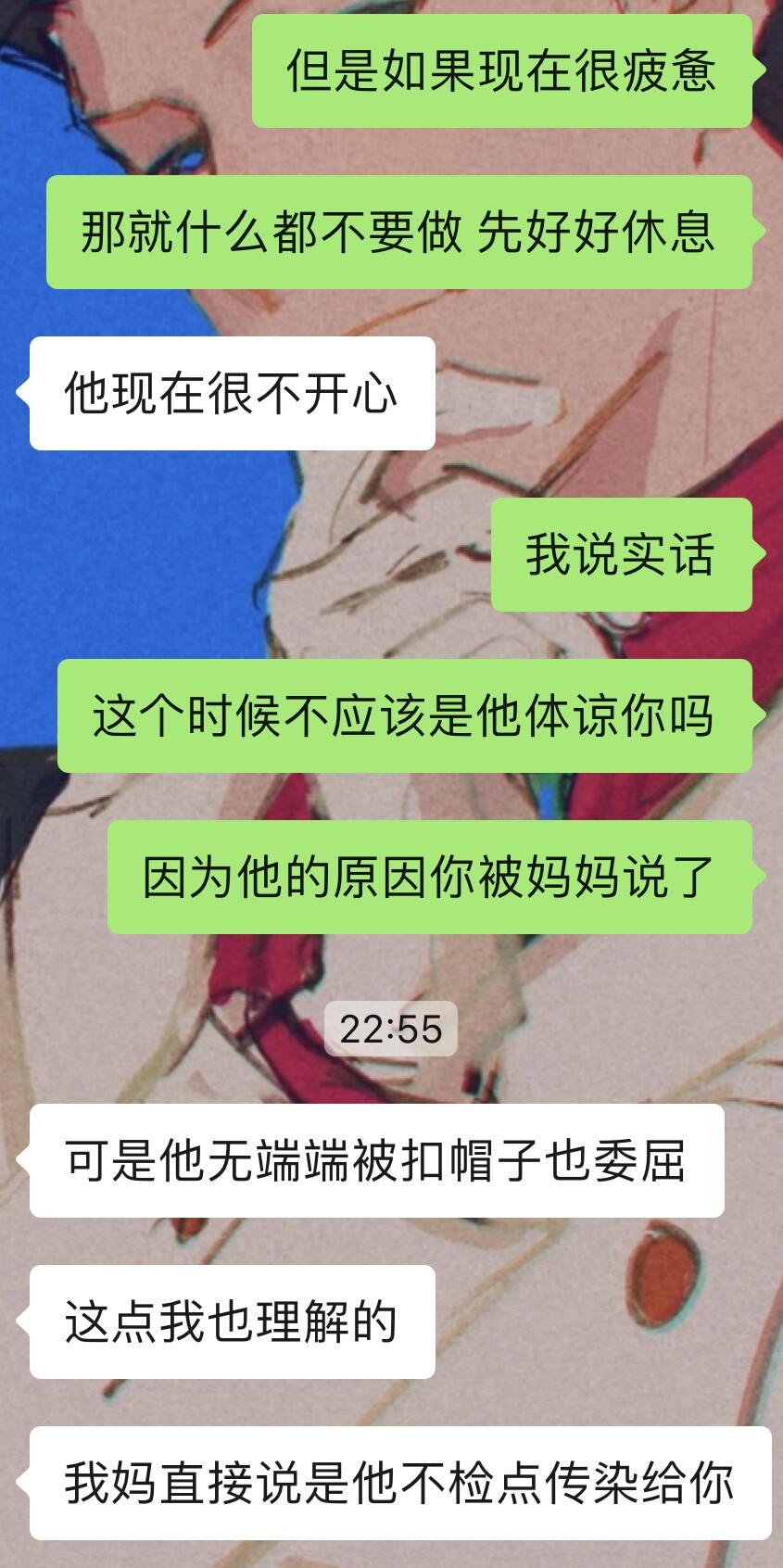 听到这里我就无名火起了,明明男的去做个检查便是,现在朋友夹在妈妈和他之间承受双重压力,还是在查出病的情况下,为什么不去体谅一下自己的女友呢?检查一下能费多少功夫?明明女友已经不得不向妈妈坦白自己有性生活并因此受到白眼。忍不住和朋友说了但她也说理解他,那我也真的没有什么话可以说了。也许是我没有谈过恋爱不懂恋爱中的人到底是怎样相处的吧。看着朋友被夹在中间的样子我心里又暗自发誓再不会碰男的一分,也许之后会破戒但此刻我的想法就是这样。