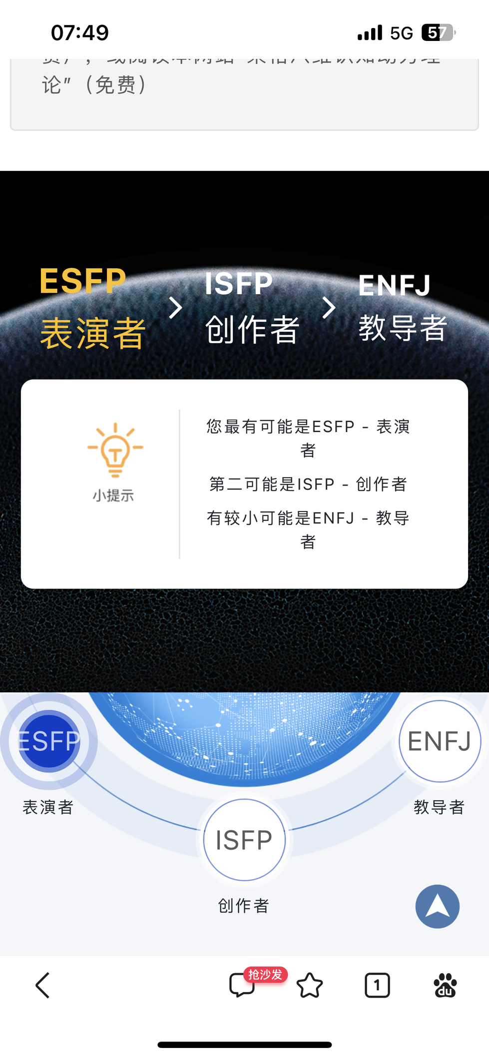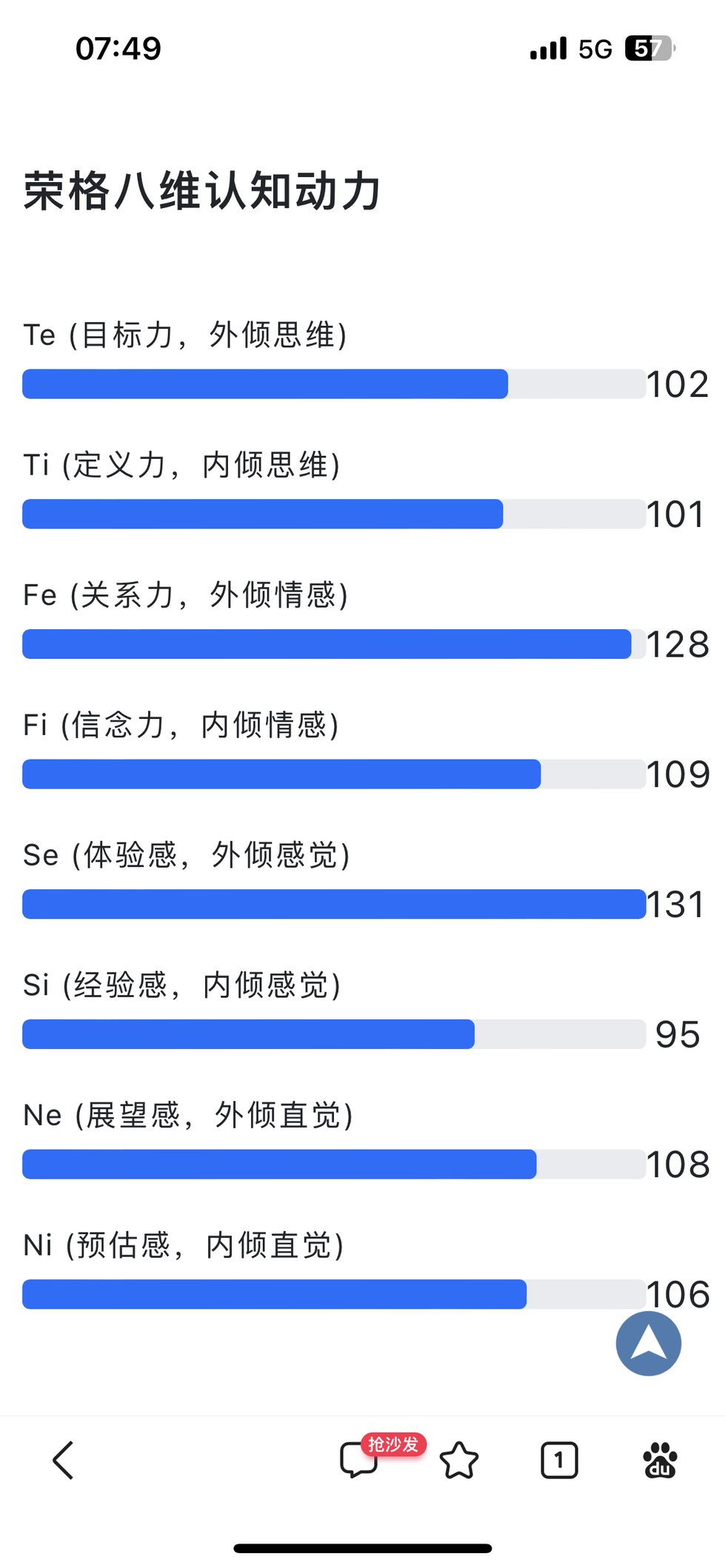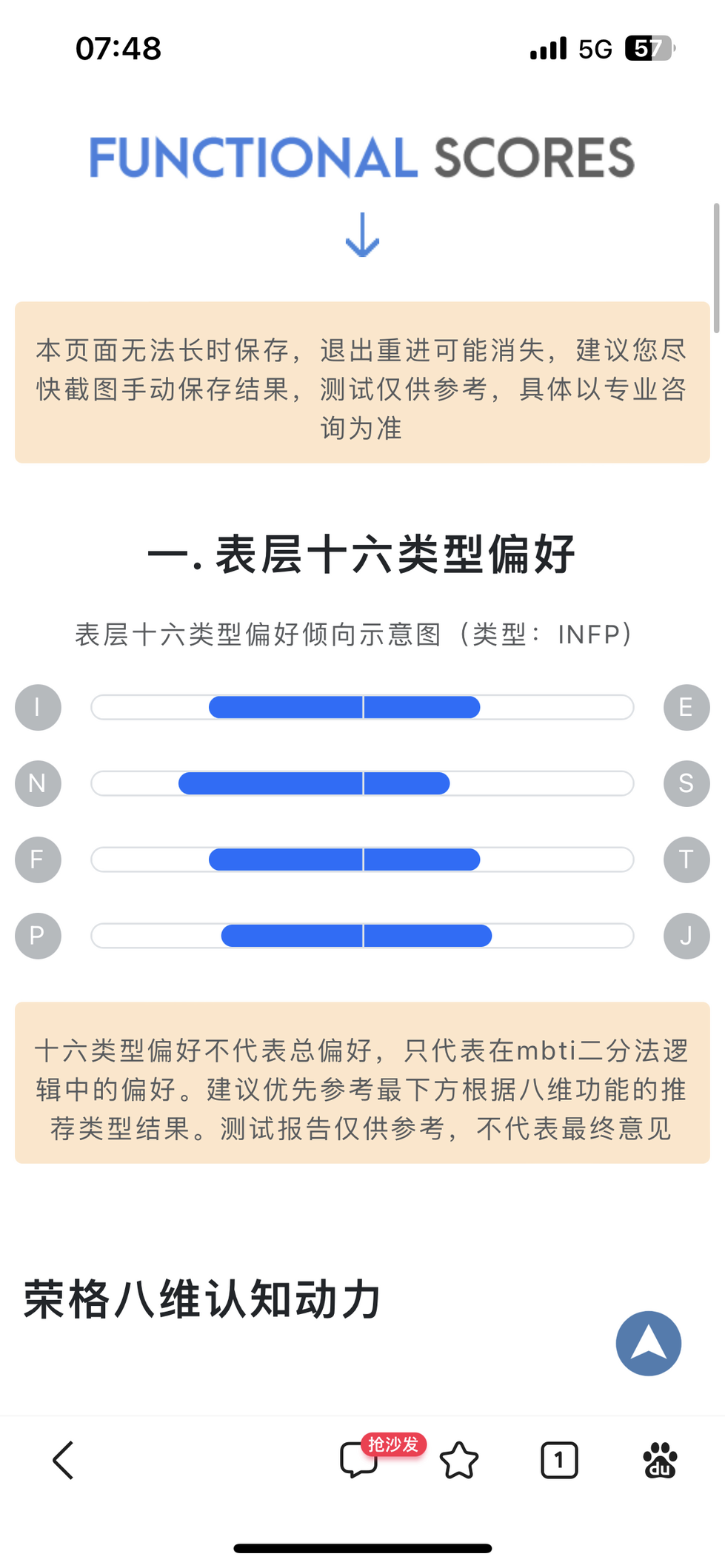 虽然对荣格八维不怎么了解但还是认真把120道题做完了,但是发现自己连结果都看不懂,只看懂了在二分法下自己永远是infp的事实 :AAAAAA: 另外我觉得如果说我现在最可能是esfp那都是上班上的 :AAAAAA: