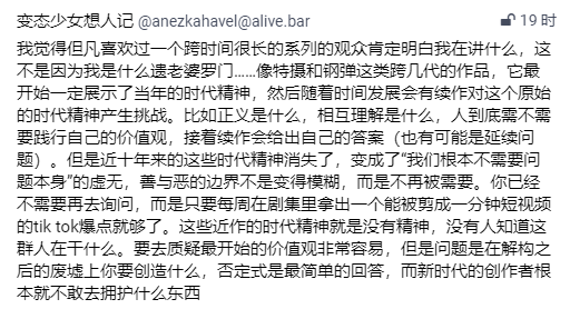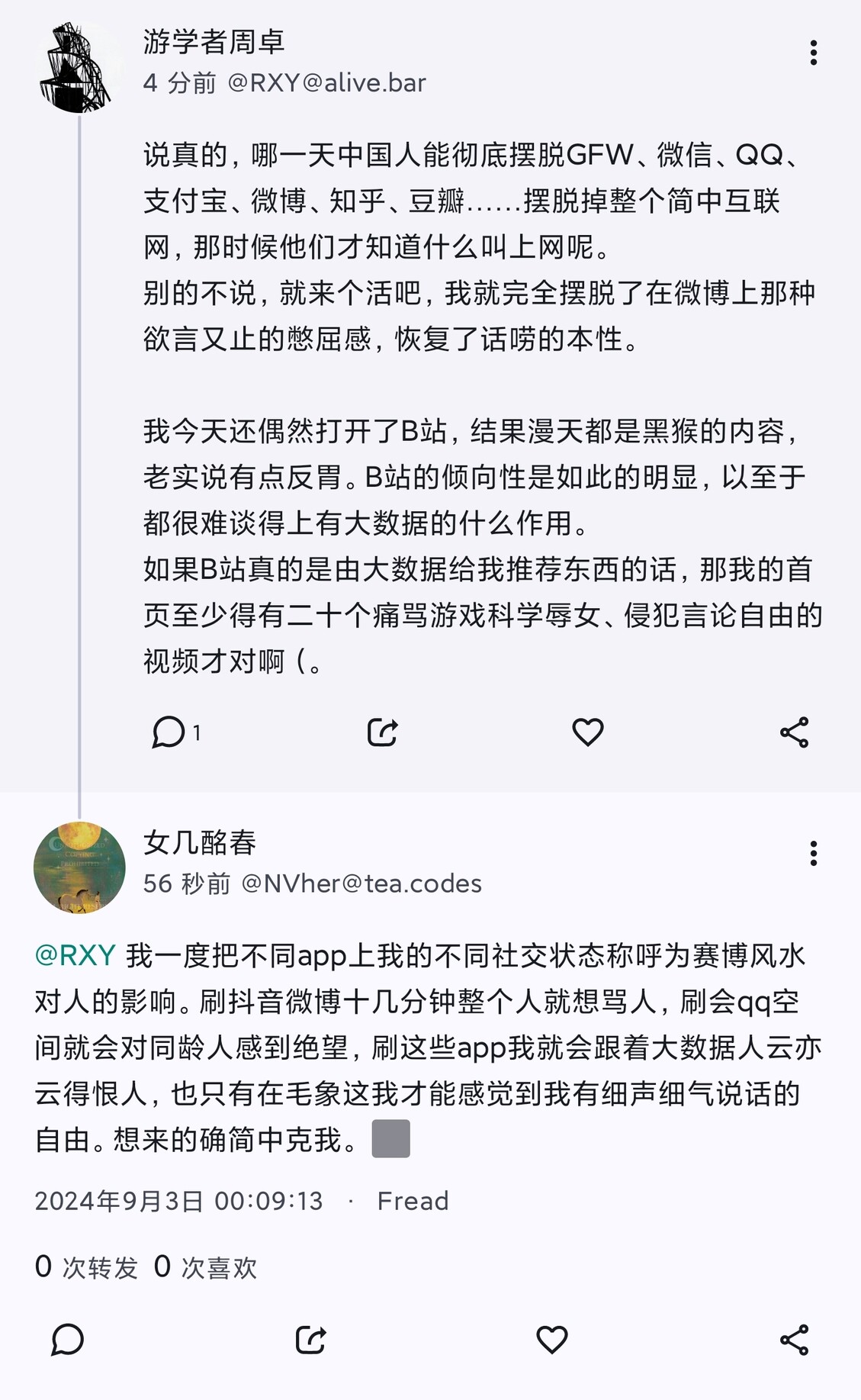 我很少这么说-因为觉得这么说太过谄媚,但我真的蛮喜欢毛象,至少现在的毛象我没遇到什么怪人,也没遇到戾气很重的在简中我称之为傻逼的网友。我能够和人进行心平气和的交流,不会觉得对面会突然发起攻击,也不会觉得自己的礼貌用语有些令人恶心的做作。因为这里大家皆是如此……推是不行了,推现在也难免有人亮着大旗来当共产主义红小将感化我这张臭嘴。