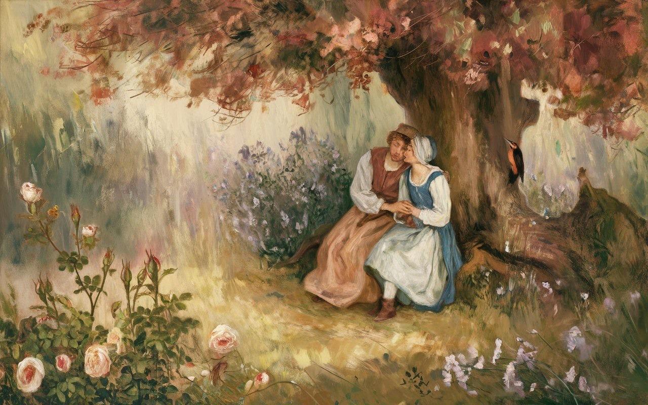 许多日子过去了,许多星期过去了,收获人的明晃晃的镰刀在麦田里发着光;苹果树枝结着红而带黄的果实,弯下来了。蛇麻一丛一丛地低垂着,发出甜美的香气。榛子林下悬着一串一串的硬壳果。一个男子和女子—“夏天”和他安静的妻子——在这儿休息着。