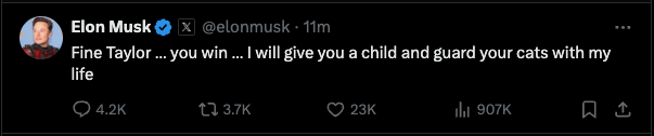 马斯克之所以敢对泰勒斯威夫特发表如此赤裸裸的性骚扰言论,恰恰是因为这在他价值观里不是性骚扰,而是“真男人”(或者说保守主义者)的担当:1、你不是不生孩子吗?但是总得有人生吧,那我来生呗,所以你们不生孩子的人要感谢我们这些生孩子的人;2、我知道喜欢这种宅家养猫的生活,问题是总要有人保卫你的生活方式吧?那就由我们这些保守主义者就来充当生产者和保卫者的角色吧——我不是在为马斯克辩护,而是在你反驳前,首先要了解他们这种人的思路(自认为的合理性)。然后才能意识到,他们最大的问题,就是自我感动。或者按照他们自己所信奉的基督教价值观来讲,叫做“自以为义”。在他们的世界观里,人类世界的存续完全是自己的功劳,左派只是纯粹的消耗者。这个观点其实一点也不新鲜,从韩非商鞅到现在的简中工业党都一个德性。要义就是只有生产没有生活,只有人口没有人生,一切不能在一级市场(农业工业)创造(肉眼可见)价值的人类行为都应该被消灭。然而对这种幼稚的基要主义右派而言,最要命问题是(你完全可以这样当面质问他们),为什么他们的想法是如此接近共产主义(不是理论上的而是实践上的)甚至秦制,而非信奉“生产不一定产生价值但交易一定产生价值”的自由主义市场经济价值观?如果你真是个经济上的右翼(不是国产奥派那种),就必须承认,不管你服气不服气,泰勒斯威夫特通过宅在家撸猫时候哼出的某个曲调挣到一个亿,与你生产火箭生产特斯拉挣到的一个亿,在经济上是完全等价的。尊重由自由交易标定的价值,才是市场经济的第一原理。或者更简洁地说,自由才是经济的第一原理。生不生孩子养不养猫,是生产者保卫者还是创造者享乐者,都是在自由这个总的原则下的选择。