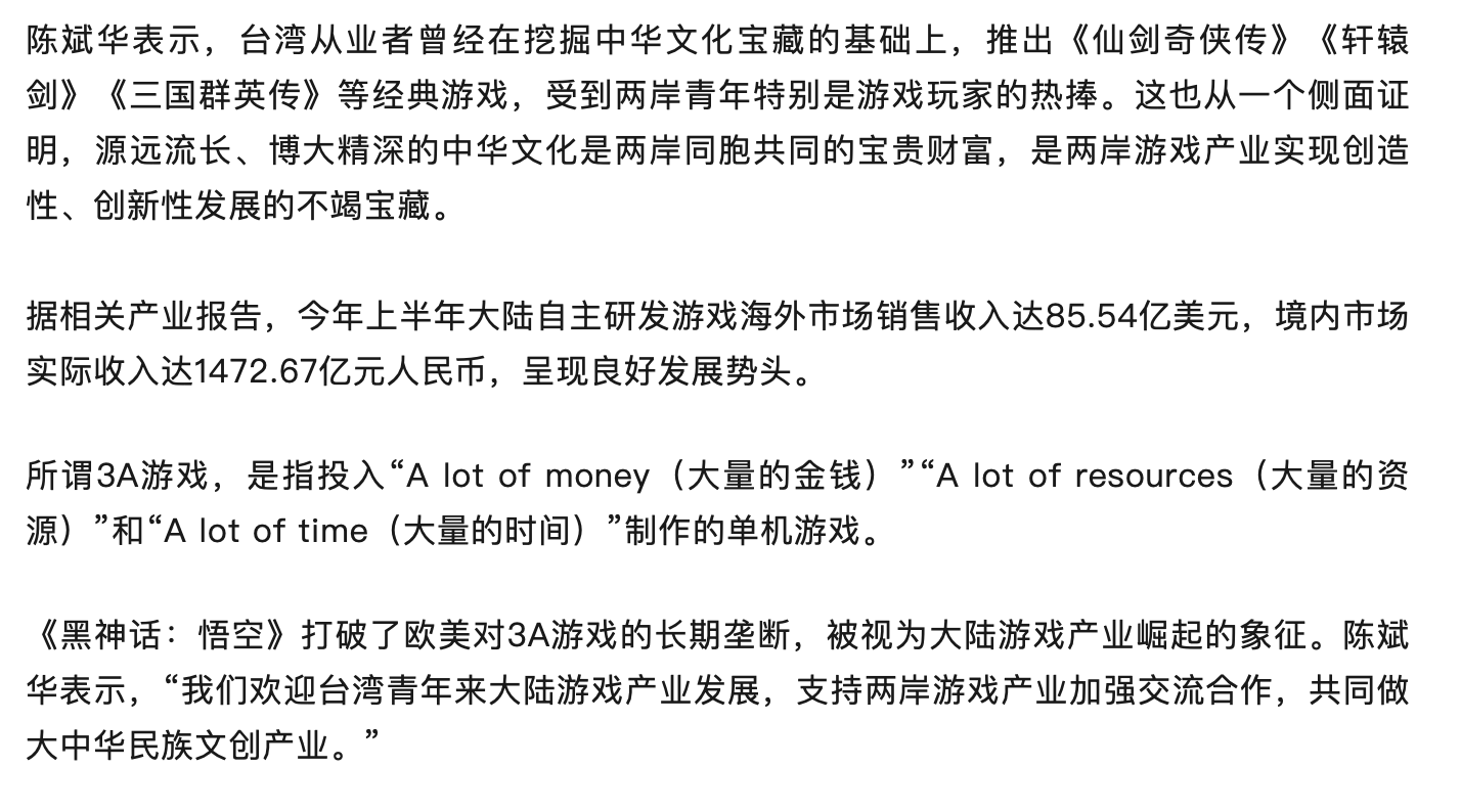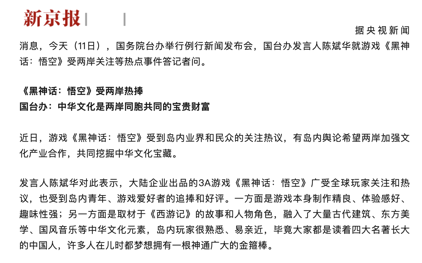 可是一旦有一个电子游戏变成国际话题,好像台湾人还挺喜欢,可以拿来搞统战,你共马上就表示欢迎了:好啊好啊,台湾人喜欢我们的《黑神话》,说明大家都是中国人!好!