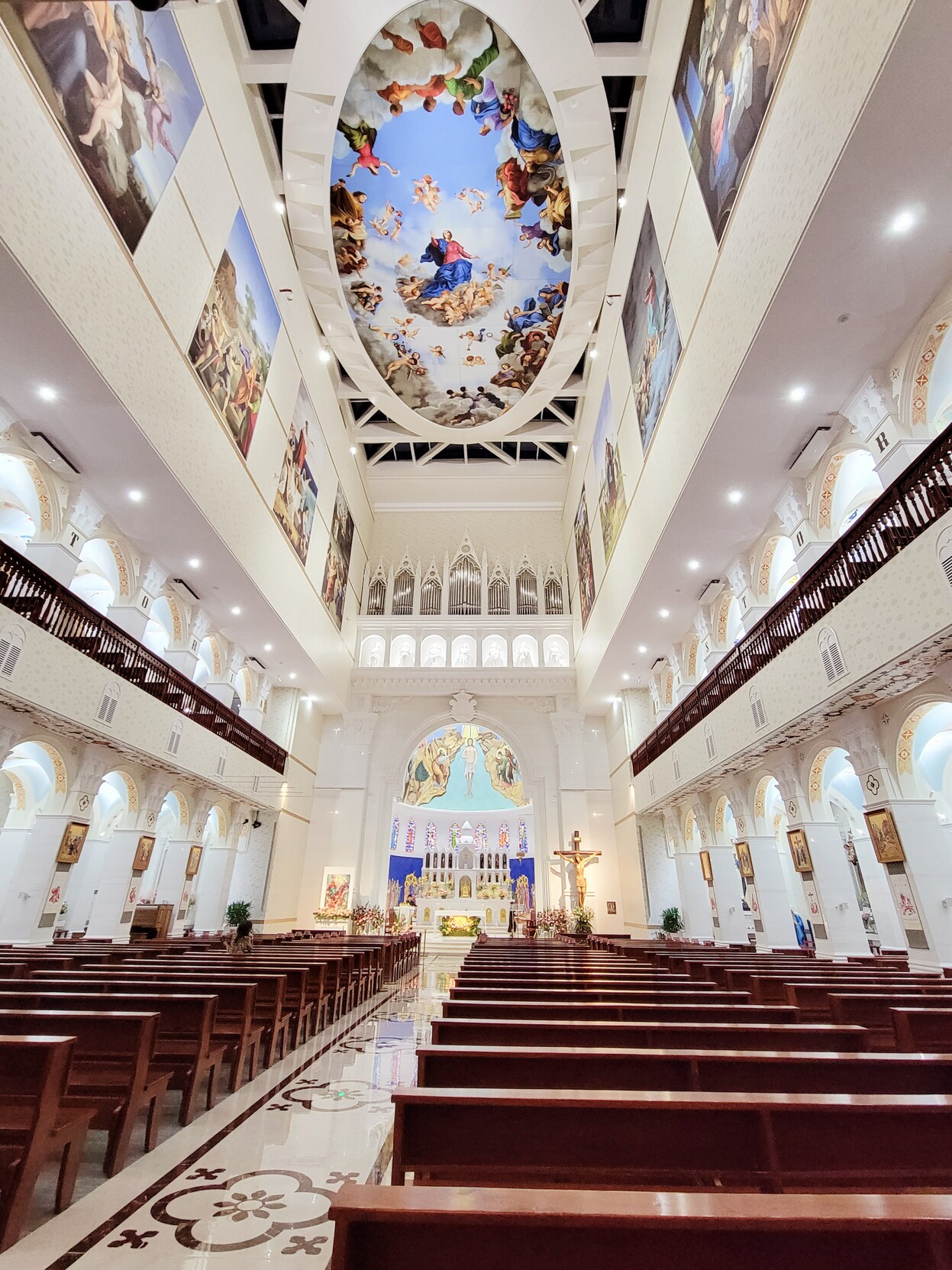 深圳圣安多尼天主堂,一座2001年建成的教堂。第一次走进去,和北京几大老教堂的古典庄重相比,这座堂有新建筑的洁净恢宏,白色为主调,四周和顶部有超大幅的壁画,仰头看,如天堂临在。赶上了晚上八点的英语默观弥撒,很意外,空旷的堂内只有十来个人,一片静默,发出一点点声音在这高广空间里都显得吵闹。默观弥撒非常简洁,只有神父一人,没有辅祭,他的英语听上去轻柔,像有珍珠在水面上滚动。弥撒礼成,大部分人走了,有位女士静静地坐在这大教堂里,闭目祈祷。我在后面看着,觉得此时此刻,信的人确实有福了,因为这圣洁的空间如此广大,此刻却只属于她,隔绝了世界的吵闹与不幸。