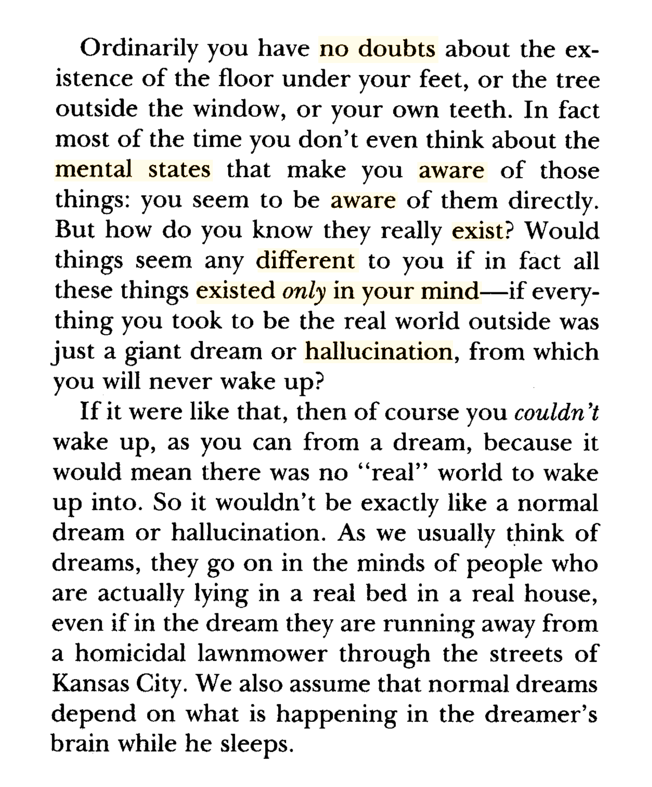 If you think about it, the inside of your own mind is the only thing you can be sure of. Whatever you believe — whether it's about the sun, moon, and stars, the house and neighbourhood in which you live, history, science, other people, even the existence of your own body — is based on your experiences and thoughts, feelings and sense impressions. That's all you have to go on directly, whether you see the book in your hands, or feel the floor under your feet, or remember that George Washington was the first president of the United States, or that water is H2O. Everything else is farther away from you than your inner experiences and thoughts, and reaches you only through them.