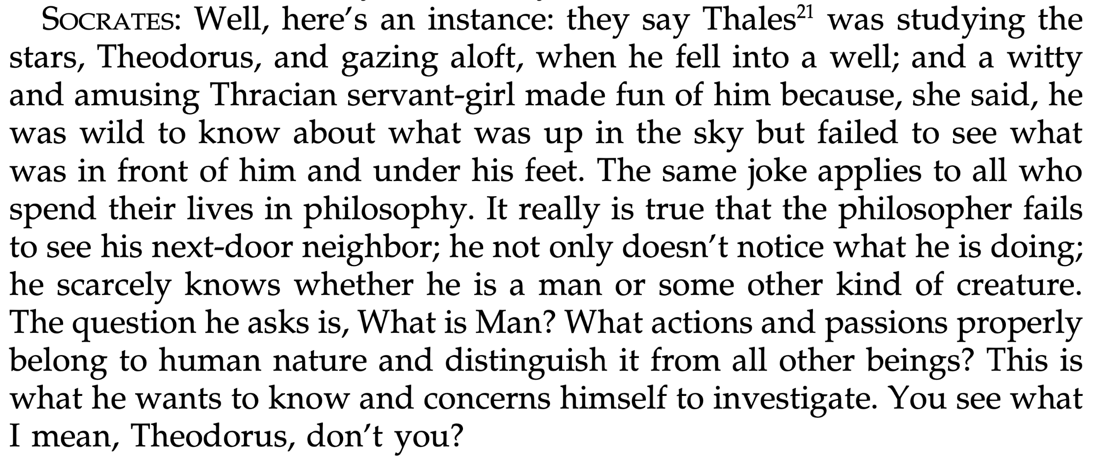 柏拉圖《對話錄》中的《泰阿泰德篇》(Theaetetus)就有關於泰勒斯的記載。有一次他只顧仰望星空觀天象,而不小心掉進了井裡,他的女僕把他救上來後嘲笑他只顧看天上的星辰,又怎麼能看見腳下的大地呢。這是柏拉圖用來引證哲學家在眾人眼中的形象的例子。