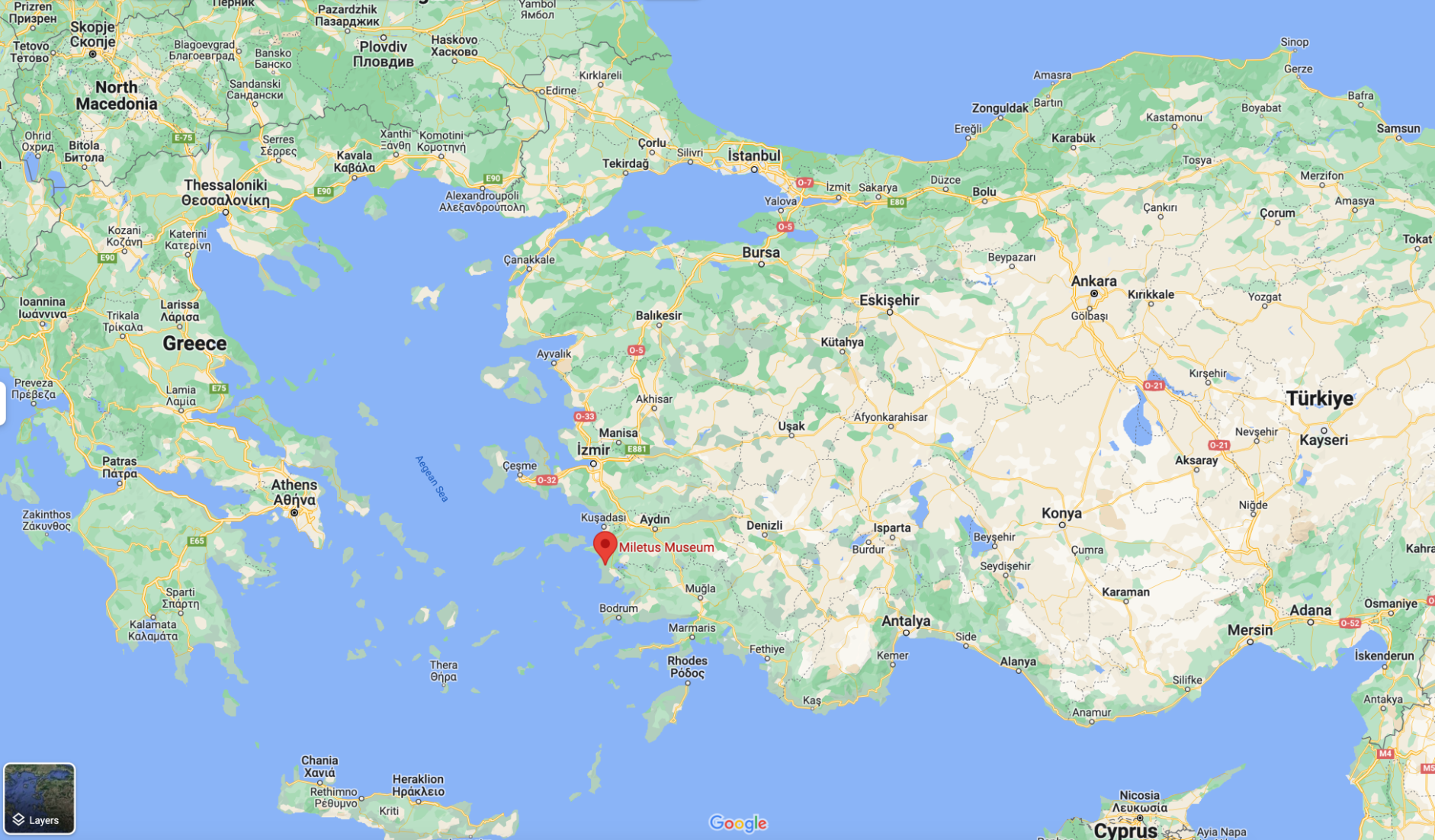 歷史上的米利都,現今在土耳其Aydın省境內(即Anatolia西岸)。下面附上地圖和TurkishMuseums.com網站的相關截圖。