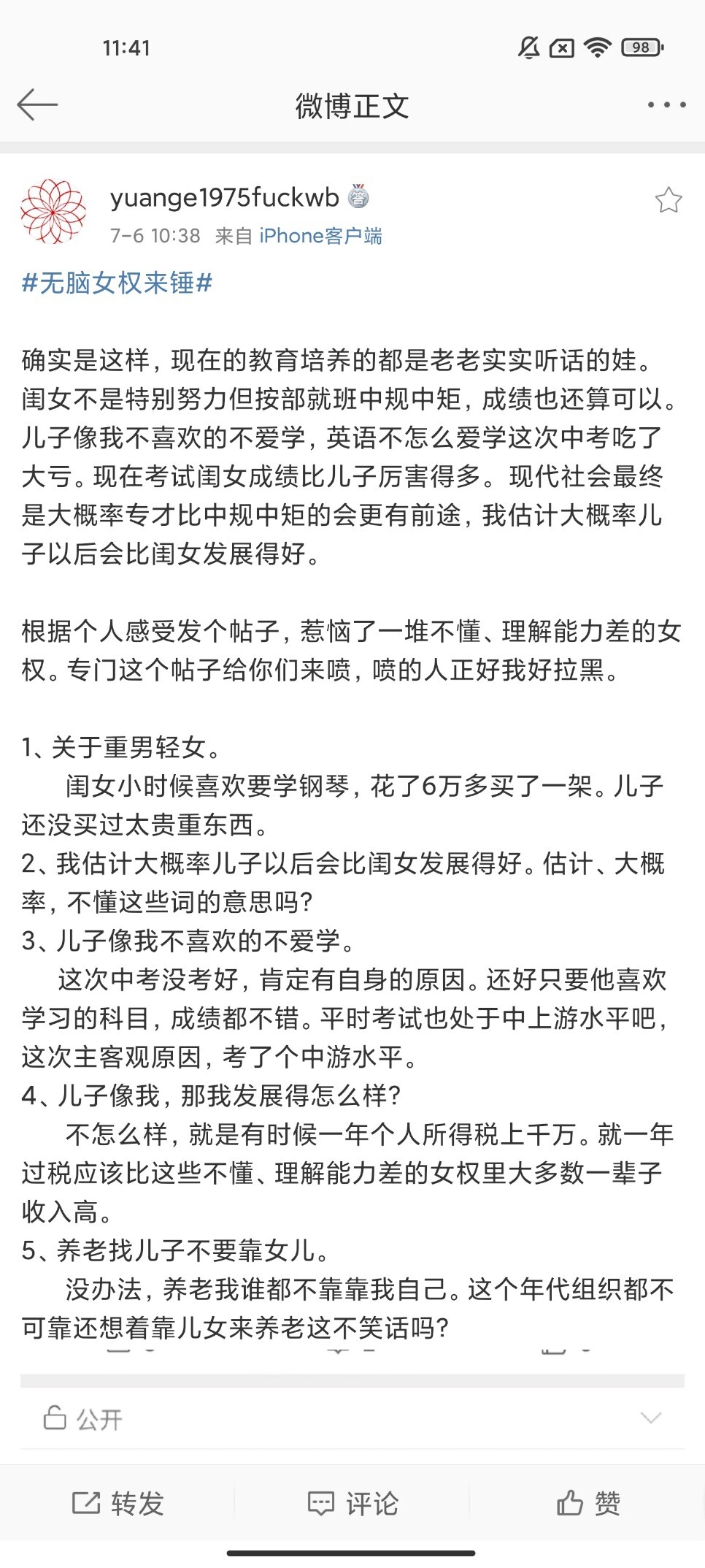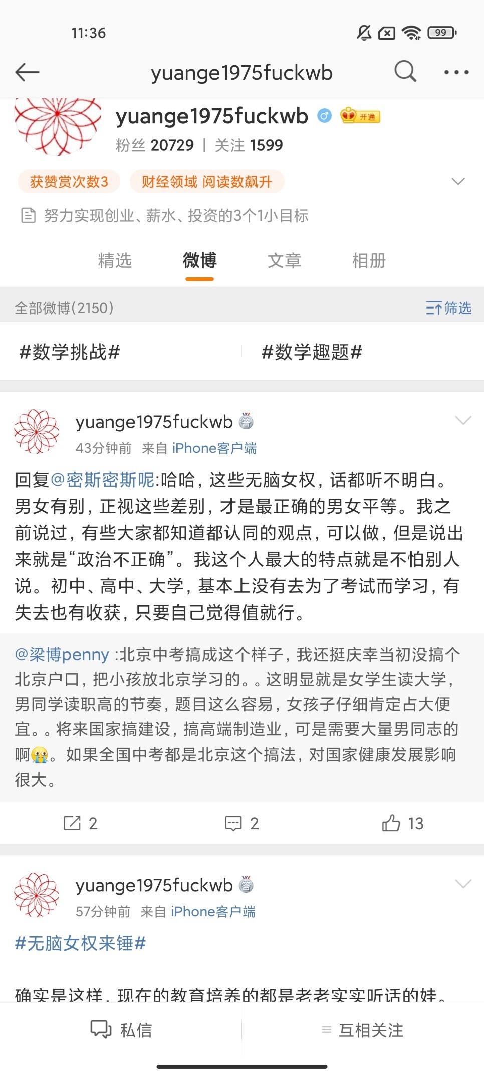 看锅男的思维方式,"我有女儿所以我有权谈女权","我没北京户口所以还是莫谈国事",论如何安全的在微博上继续"爹淆",所以锅男即使学数学也不会改变他们淆的脑结构。
