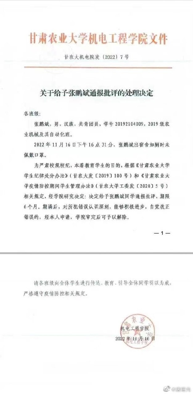 甘肃农业大学,一名学生因上厕所时不戴口罩被全校通报批评。