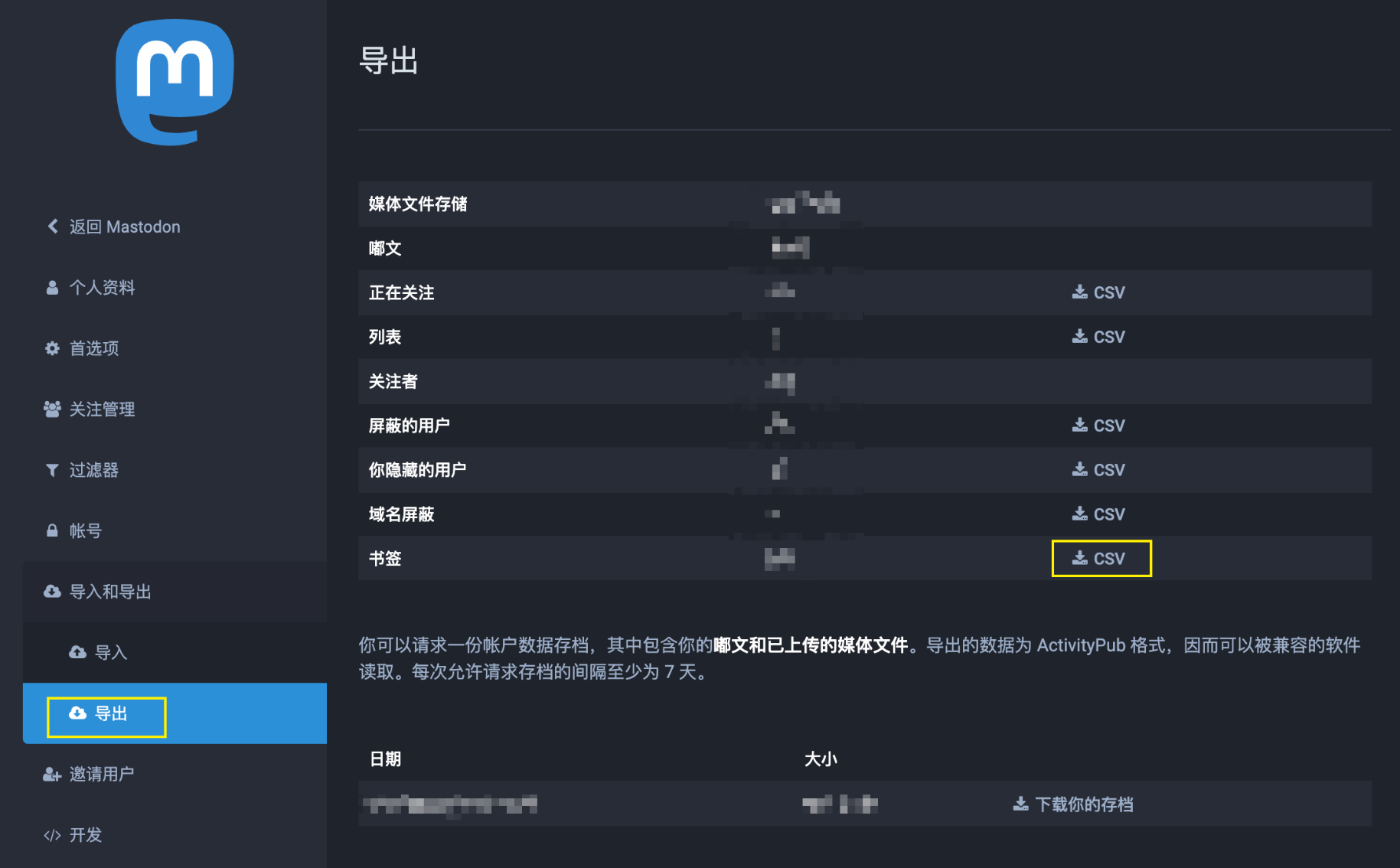 1、长毛象可以导出所有收藏的csv格式,也就是一个包含链接的表格