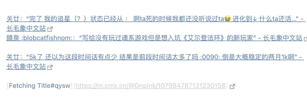 ⚠️:这个插件有两个方式,一是粘贴时自动抓取,一是快捷键(cmd+shift+e)转换已有链接。但是好像都只能一个一个转(虽然用快捷键很快,光标靠着链接按快捷键就可以转了),我还没找到能批量转的方法