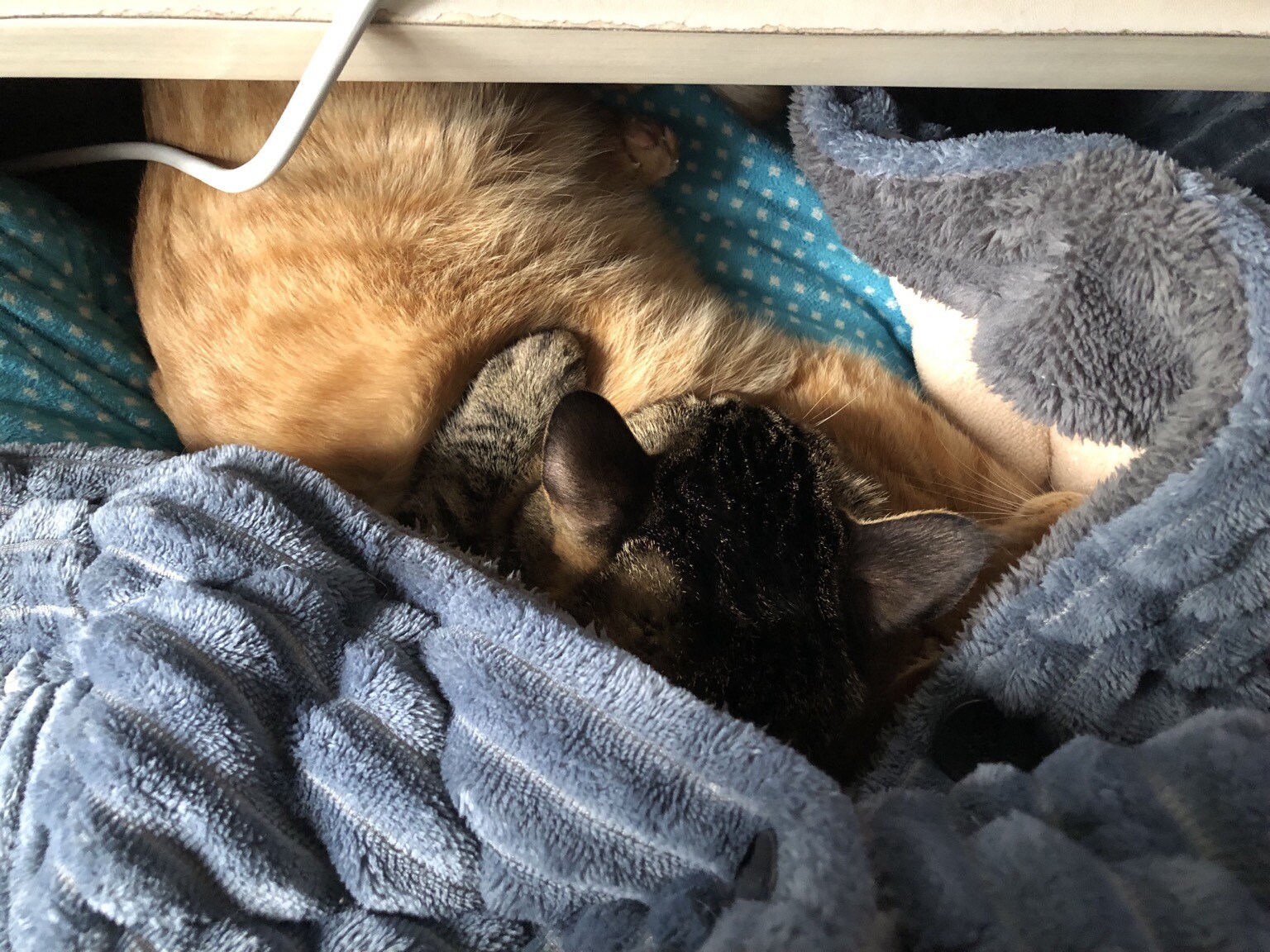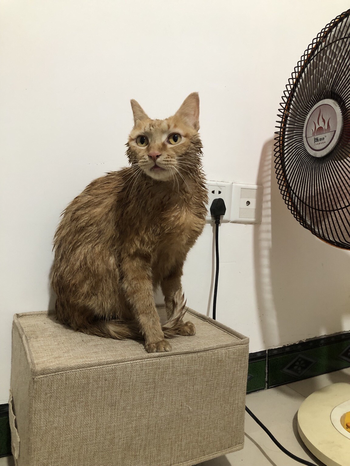 吹风当然是不让用的,声音让她害怕。只能开着小太阳,拿毛巾(衣服)给她不停地擦。没擦两下就又不干了,不让抱不让擦,就要跑走自己去舔。精准找到三个位置供自己舔毛,一旦我把小太阳给她放过去就立马换一个位置。要气死我。