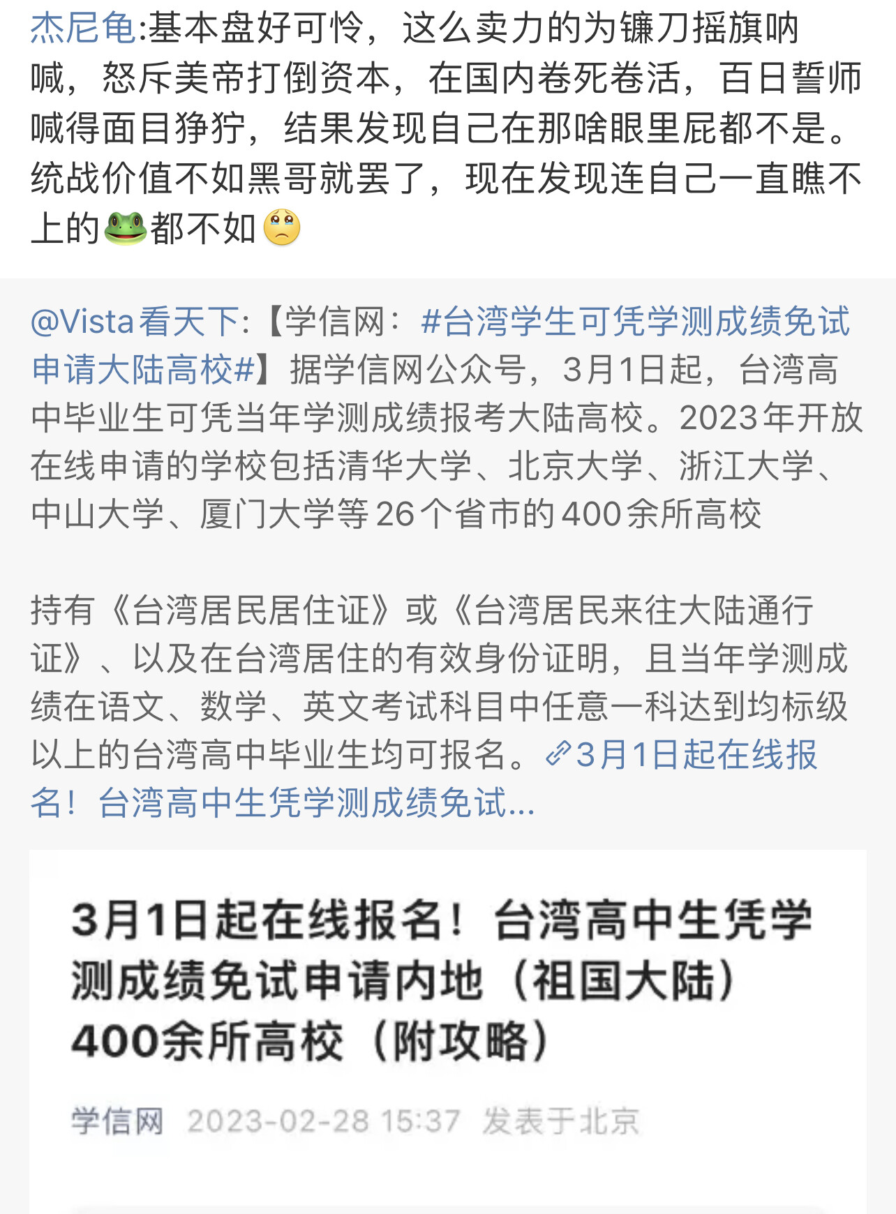 “ 基本盘好可怜,这么卖力的为镰刀摇旗呐喊,怒斥美帝打倒资本,在国内卷死卷活,百日誓师喊得面目狰狞,结果发现自己在那啥眼里屁都不是。统战价值不如黑哥就罢了,现在发现连自己一直瞧不上的🐸都不如”