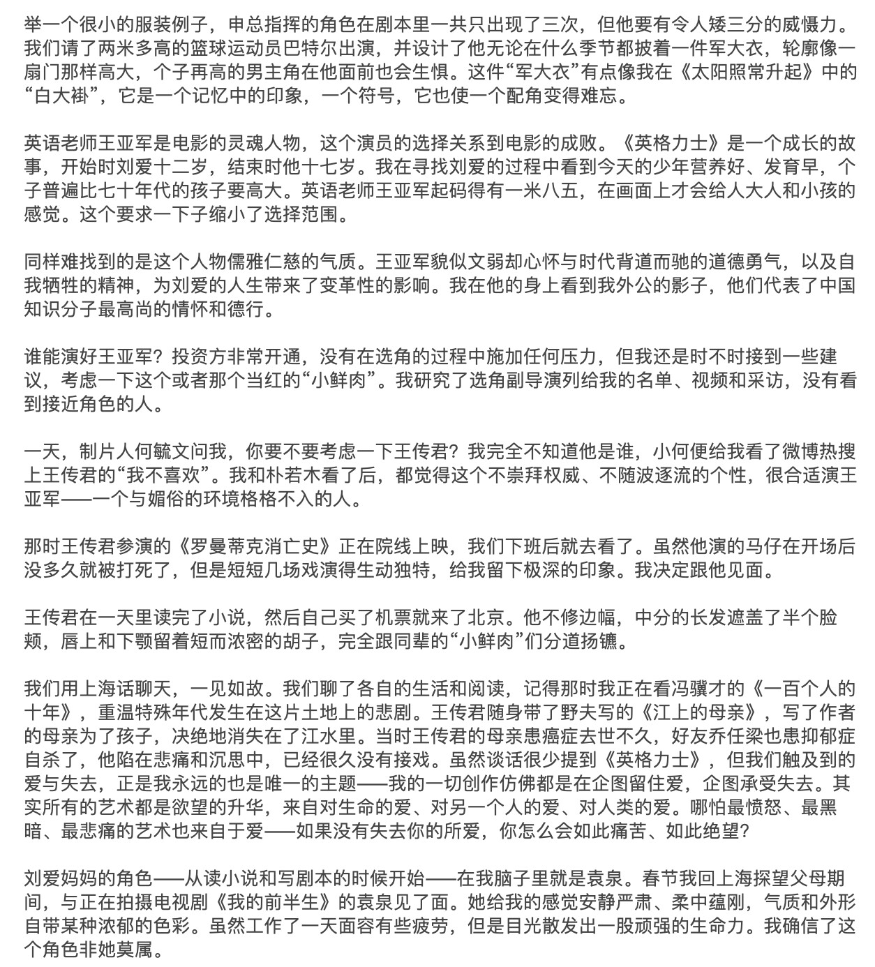 “刘爱妈妈的角色——从读小说和写剧本的时候开始——在我脑子里就是袁泉。春节我回上海探望父母期间,与正在拍摄电视剧《我的前半生》的袁泉见了面。她给我的感觉安静严肃、柔中蕴刚,气质和外形自带某种浓郁的色彩。虽然工作了一天面容有些疲劳,但是目光散发出一股顽强的生命力。我确信了这个角色非她莫属。